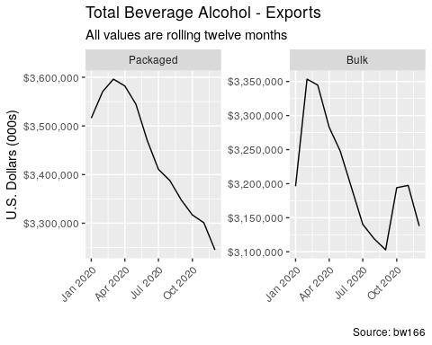 • Exported packaged spirits for the last twelve months declined -23% by volume and declined -5% by value. Over the last three months, volumes declined -10% and declined -20% by value.