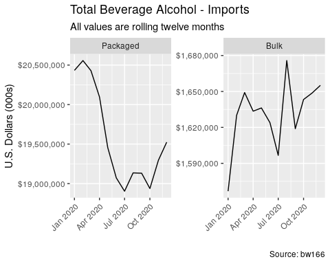 Beer, Spirits, & Wine – Packaged Imports Decline -4% By Value L12M through December 2020, Packaged Exports Decline -6%