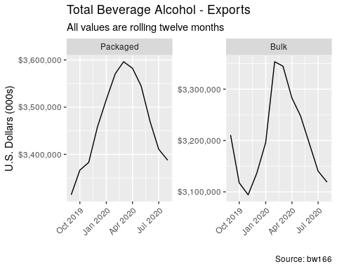 • Exported packaged spirits for the last twelve months declined -37% by volume and grew +5% by value. Over the last three months, volumes declined -27% and declined -26% by value.