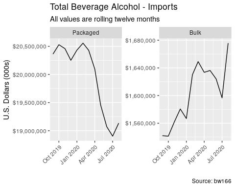 Beer, Spirits, & Wine – Packaged Imports Decline -5% By Value Over L12M through August 2020, Packaged Exports Grow +2%