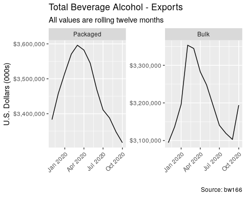 • Exported packaged spirits for the last twelve months declined -32% by volume and grew +2% by value. Over the last three months, volumes declined -6% and declined -11% by value.
