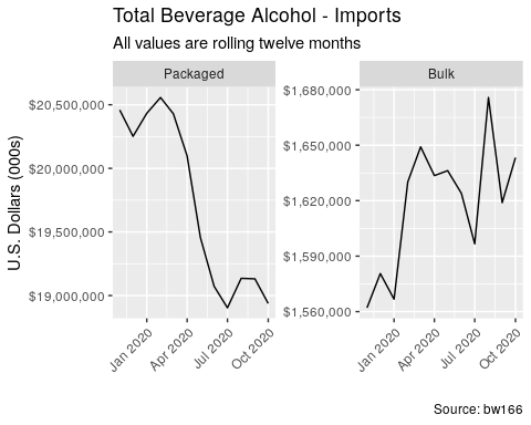 Beer, Spirits, & Wine – Packaged Imports Decline -8% By Value L12M through October 2020, Packaged Exports Decline -2%