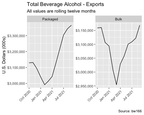 • Exported bulk spirits for the last twelve months declined -1% by volume and grew +6% by value. Over the last three months, volumes grew +2% and grew +18% by value.