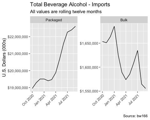 Beer, Spirits, & Wine – Packaged Imports Grow +18% By Value L12M through September 2021, Packaged Exports Grow +8%
