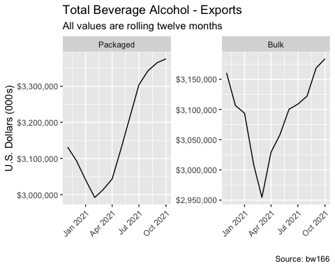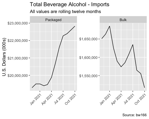 Beer, Spirits, & Wine – Packaged Imports Grow +20% By Value L12M through October 2021, Packaged Exports Grow +8%