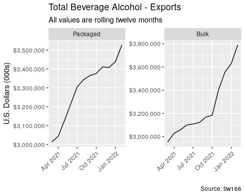 • Total beverage alcohol exports (included bulk and packaged) grew +22% by value over the last twelve months and grew +33% by value over the last three months. 28% of all exported beverage alcohol by value went to Canada over the last twelve months.
