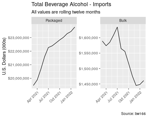 Beer, Spirits, & Wine – Packaged Imports Grow +23% By Value L12M through February 2022, Packaged Exports Grow +18%
