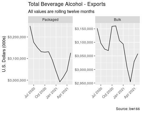 - Total beverage alcohol exports (included bulk and packaged) declined -5% by value over the last twelve months and grew +12% by value over the last three months. 26% of all exported beverage alcohol by value went to Canada over the last twelve months.