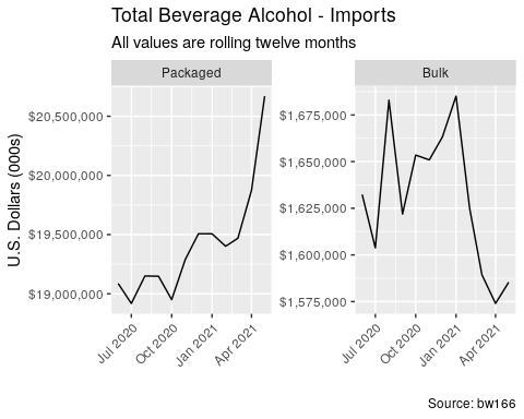 - Total beverage alcohol imports (including bulk and packaged) grew +5% by value over the last twelve months and grew +26% by value over the last three months. 35% of all imported beverage alcohol by value came from Mexico over the last twelve months.