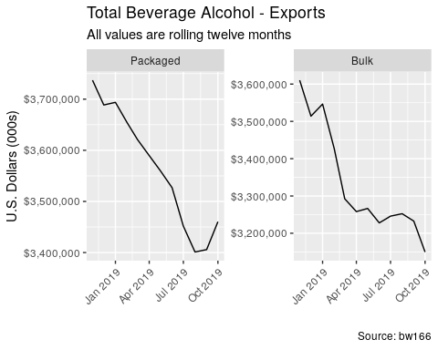 • Total beverage alcohol exports (included bulk and packaged) declined -10.0% by value over the last twelve months and declined -4.90% by value over the last three months. 20.6% of all exported beverage alcohol by value went to Canada over the last twelve months.