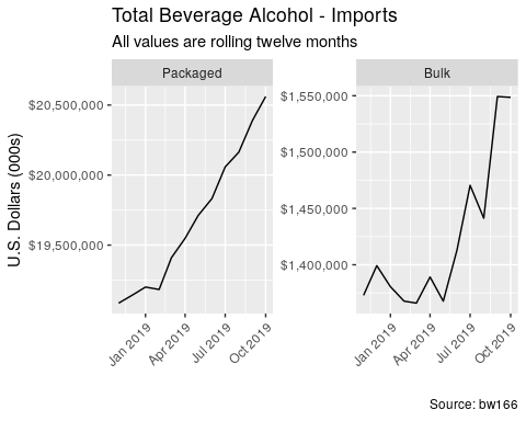 Beer, Spirits, & Wine – Packaged Imports Grow +8.00% By Value Over Last Twelve Months through October 2019, Packaged Exports Decline -8.60%