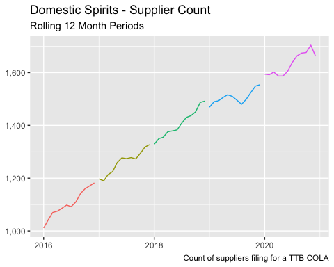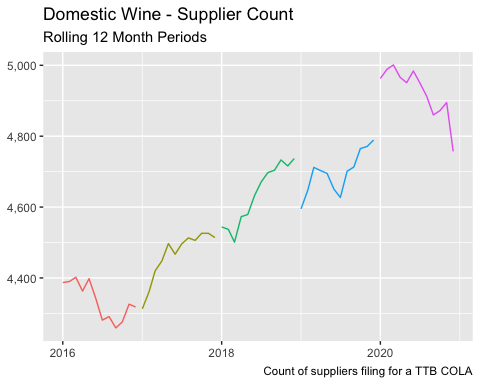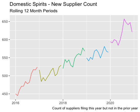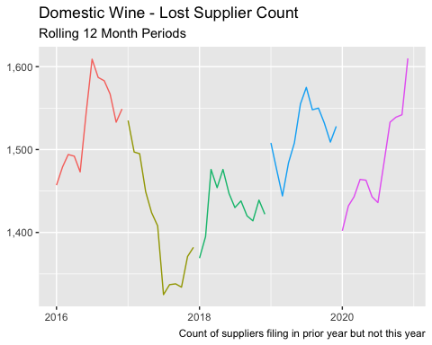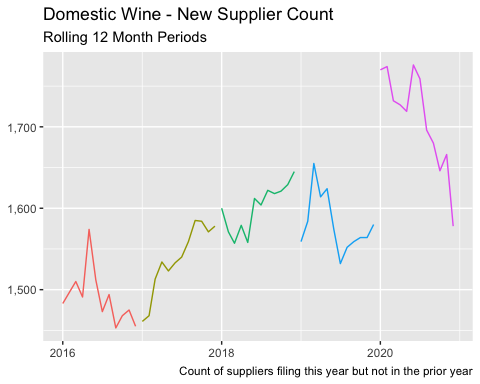 • New wine suppliers showed a steady though slight positive increase from 2016 through 2019 – starting at 1,480 in January 2016 and ending at 1,580 in December 2019. The government shutdown explains the rapid rise in January 2020 (1,770 new suppliers). This shift also explains the apparent drop in new suppliers through 2020, ending at 1,580 in December 2020 – exactly in line with the historically stable numbers.