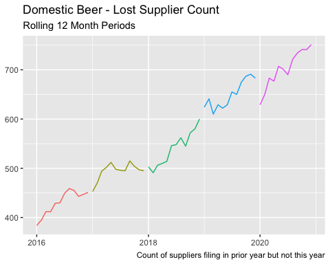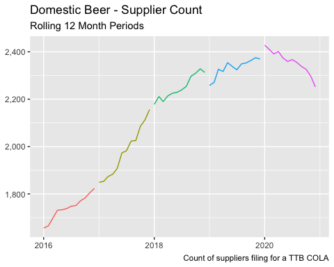 Using bw166’s Label Inquiry tool, we’ve compiled data on how many suppliers have submitted COLAs to the TTB from 2016 through 2020. This data allows us to identify suppliers that have consistently filed COLAs year over year, when suppliers have first filed COLAs, and identify suppliers that filed previously but not in the current term. While there are limits to this dataset (i.e., not all beer products require a TTB COLA), the consistent measurement over time allows for a reasonable degree of confidence in the results.