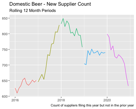 • New beer suppliers spike in early 2018 and have declined since, with a more pronounced decline in 2020. In January 2020, there were 800 new suppliers versus only 630 in December 2020 (this was roughly the level of new entrants in 2016).