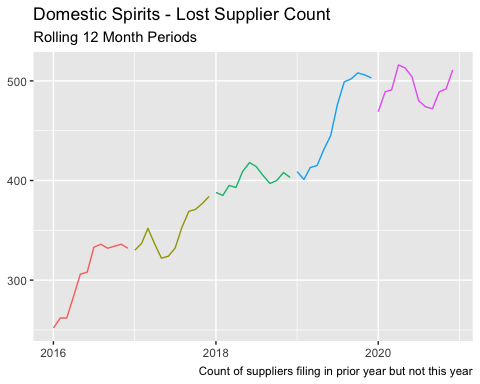 • Lost spirits suppliers have been steadily rising from 2016 through 2019 – starting at 250 in January 2016 and ending at 503 in December 2019. This trend has been reasonably stable throughout 2020 – staying just above or below that 500 supplier count (ranging between 470 and 520 during any particular month).
