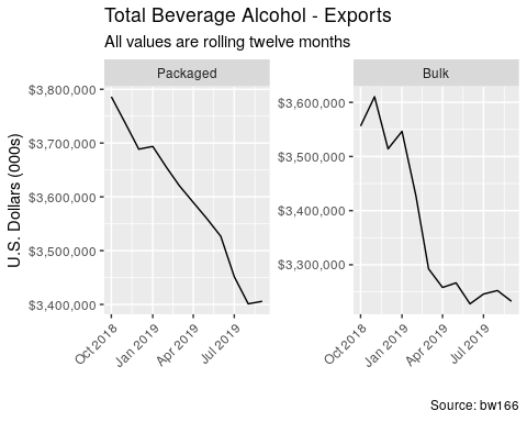 • Total beverage alcohol exports (included bulk and packaged) declined -9.70% by value over the last twelve months and declined -6.70% by value over the last three months. 20.4% of all exported beverage alcohol by value went to Canada over the last twelve months.