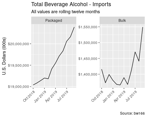 • Total beverage alcohol imports (including bulk and packaged) grew +8.40% by value over the last twelve months and grew +13.5% by value over the last three months. 25.7% of all imported beverage alcohol by value came from Mexico over the last twelve months.